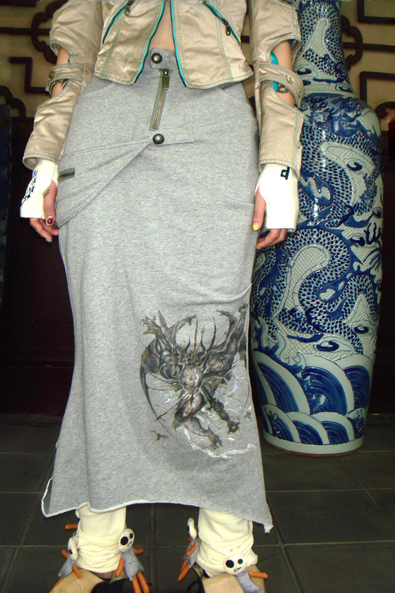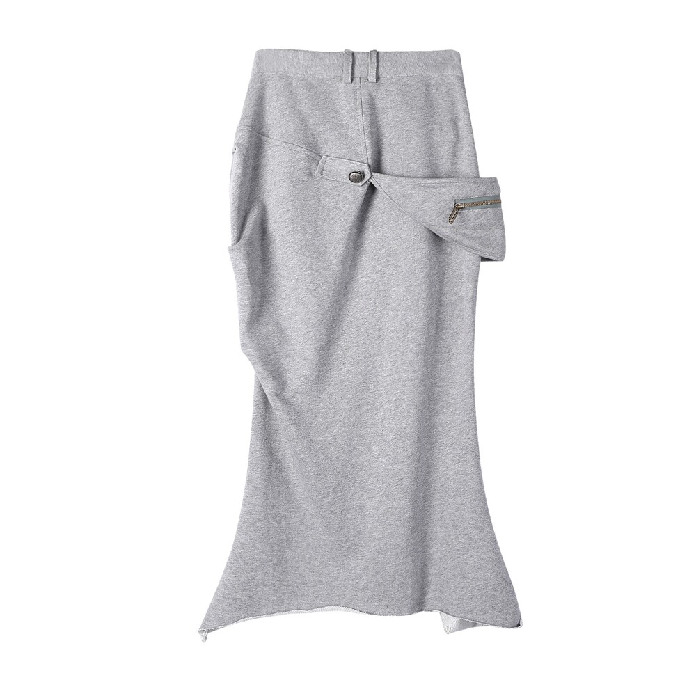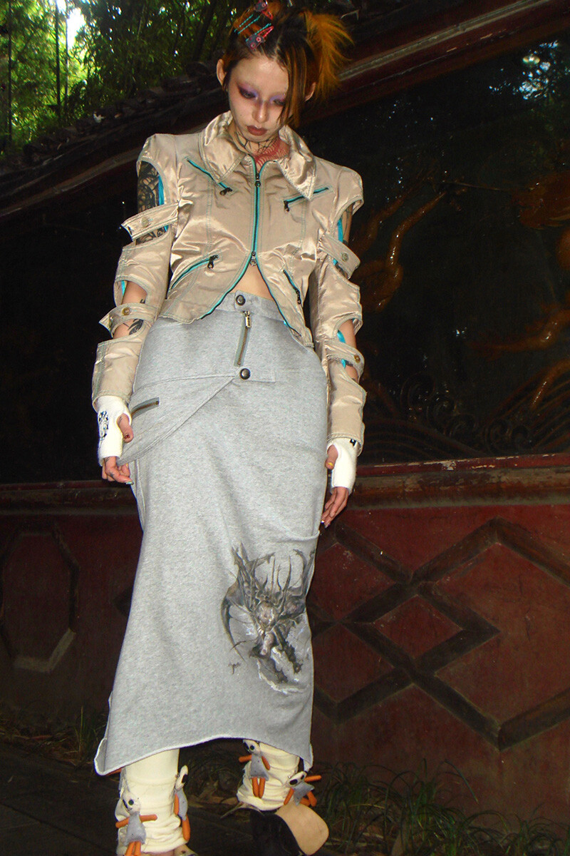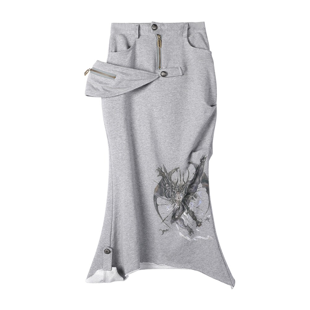 “Black-eyed-mutant-dragon” Splicing Grey Cotton Midi Skirt