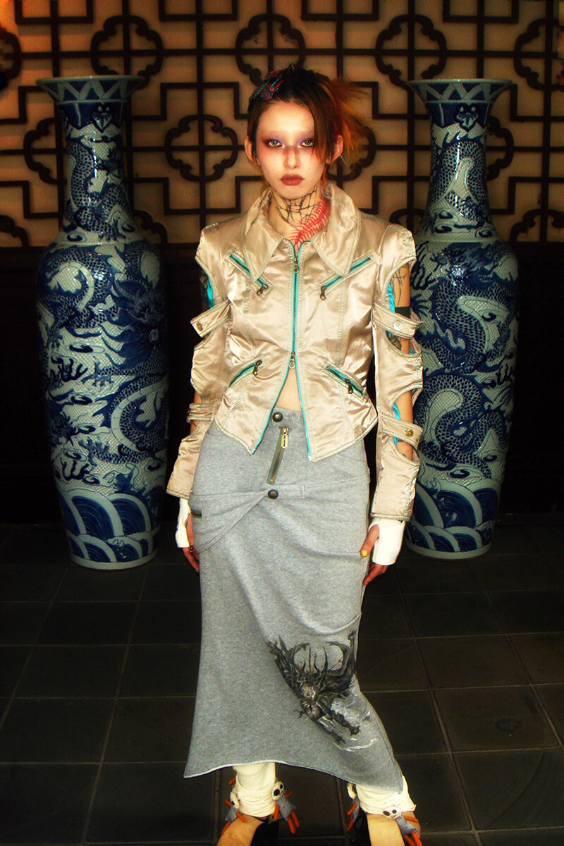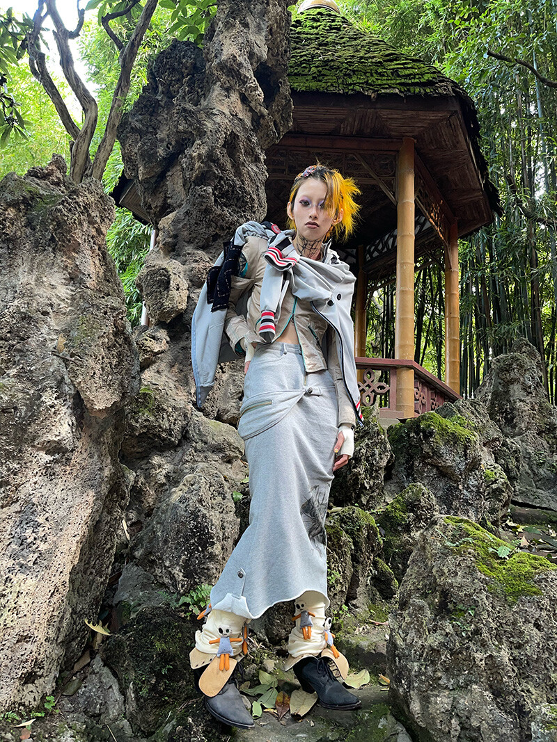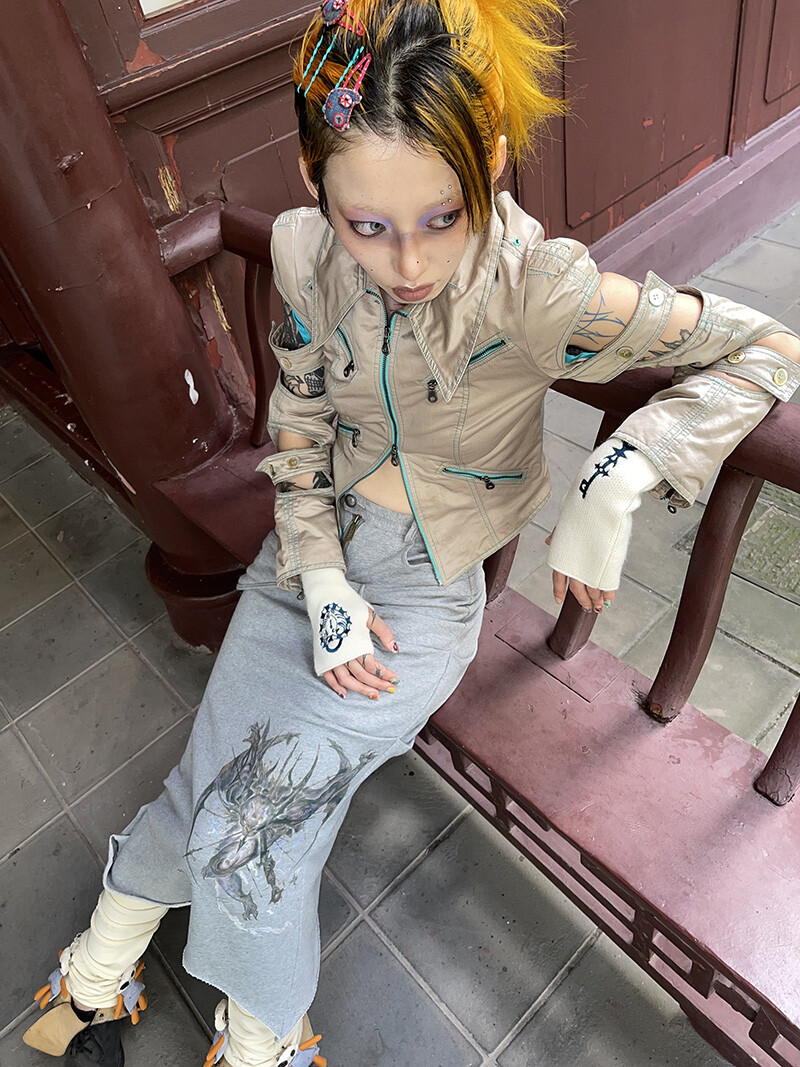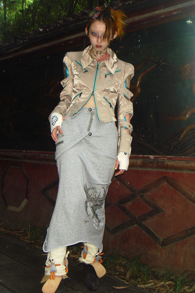 “Black-eyed-mutant-dragon” Splicing Grey Cotton Midi Skirt